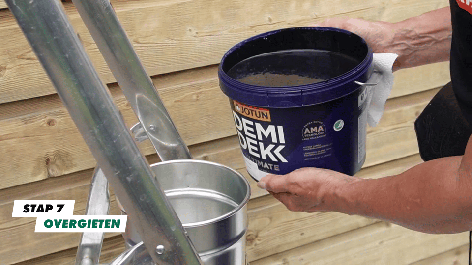 Giet de beits vervolgens in een strijkvaatje. Dit doe je zodat de beits in de emmer niet vies wordt.