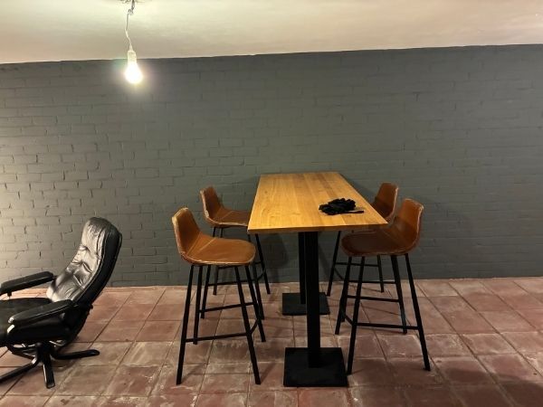 De donkere tint laat de bakstenen structuur mooi naar voren komen en vormt een sterk contrast met de houten tafel en de warme kleur van de stoelen. Hierdoor voelt de eethoek meteen gezelliger en stijlvoller aan.