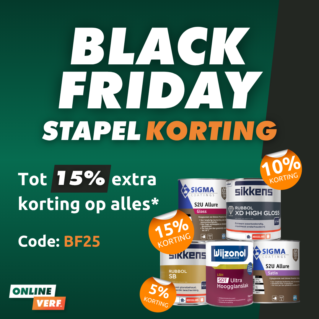 Black Friday is aangebroken bij Onlineverf! Profiteer van kortingen tot 15% op het totale assortiment!* Hoe hoger het bestelbedrag, hoe hoger de korting. Gebruik de code BF25 om te profiteren. Bestel vanaf: