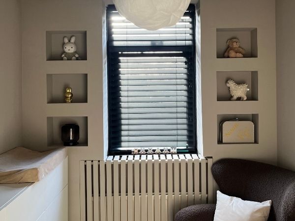 De voor-en-na foto's laten het al zien: Mylene heeft met één kleur en een beetje creativiteit een complete sfeer neergezet. Het nisjesmeubel, de warme verlichting en het contrast met het zwarte kozijn maken dit tot een droom van een babykamer.