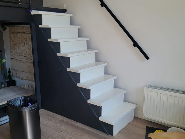 De trap van Carla had een natuurlijke houtlook. Warm, maar ook wat zwaar in combinatie met de donkere wangen (zijkanten). Door te kiezen voor RAL 9010 (Zuiver wit) kreeg de trap direct een moderne, frisse uitstraling. Het contrast met de zwarte zijkanten en leuning maakt het geheel strak en eigentijds.