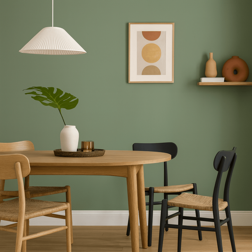 Gebruik je Sturdy Leaf als muurverf, dan krijgt je ruimte direct een stoere maar stijlvolle basis. Vooral in combinatie met natuurlijke materialen zoals hout, rotan of linnen komt deze kleur prachtig tot zijn recht. Kies voor een matte variant zoals Flexa Creations Muurverf Extra Mat voor een zachte uitstraling met diepgang.