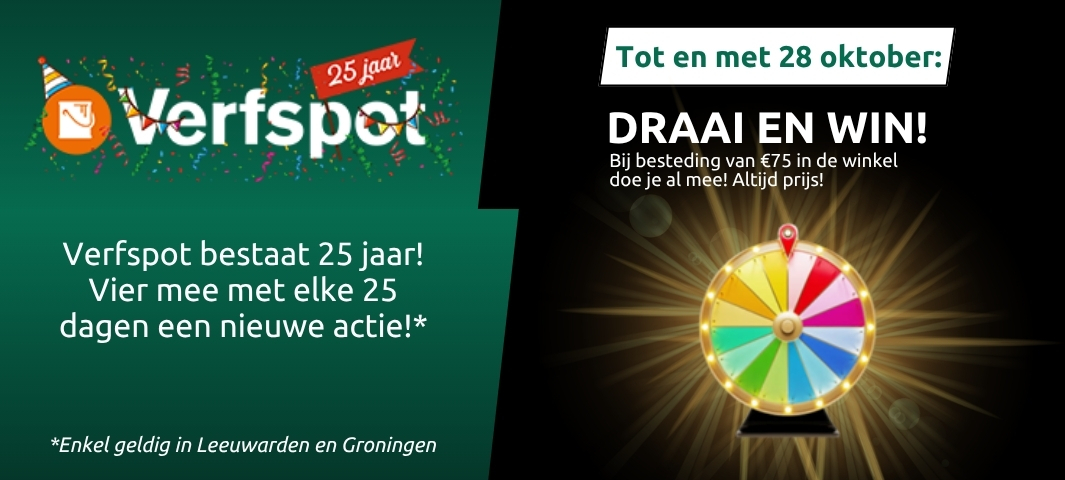 Verfspot bestaat dit jaar 25 jaar en daarom pakken wij groots uit! Ter ere van ons jubileum hebben wij elke 25 dagen een nieuwe actie!